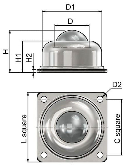 Surface Fixed Steel Ball Transfer Units: Ball transfer units are designed for multi-direction materials handling solutions. This series of transfer units consists of a large load-bearing steel ball running on several smaller support balls contained within a zinc-plated carbon steel flanged housing, allowing the large ball to rotate freely. Surface Mount ball transfer units have holes on the flange which allow the user to securely fasten down and secure the ball transfer unit onto a flat surface for greater stability.