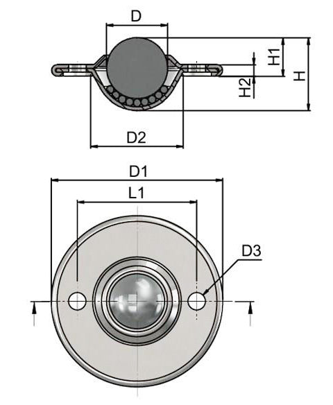 Surface Fixed Dish Type Steel Ball Transfer Units: Ball transfer units are designed for multi-direction materials handling solutions. This series of transfer units consists of a large load-bearing steel ball running on several smaller support balls contained within a zinc-plated carbon steel "dish" style housing, allowing the large ball to rotate freely. Surface Mount ball transfer units have holes on the flange which allow the user to securely fasten down and secure the ball transfer unit onto a flat surface for greater stability.