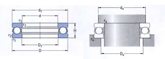 Thrust Ball Thrust Bearings: These bearings consist of three parts, a shaft and housing washer that have annular grooves in them and a caged ball bearing assembly that is sandwiched in between them. Assembly and mounting is a simple operation as the parts are separate. They support axial loads in one direction. Clearance is provided in the bore of one of the raceways to allow for alignment. Benefits: Axial loading, ease of mounting and assembly |