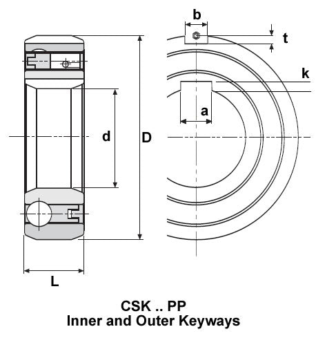 CSK Series: This range of clutches can be used as freewheels and can be used in backstop, overrunning or indexing applications. Freewheel bearings are characterised by their ability to turn in one direction only and thus transmit torque whilst having a zero backlash. They are supplied filled with grease and are low maintenance. The torque is transmitted on the inner and outer race by an external key way to the housing and onto the shaft by an internal key way. Operating temperature range: minus 40 deg F to plus 212 deg F or minus 40 deg C to plus 100 deg C Benefits: Cost effective replacement clutch bearing, low maintenance, Internally keyed |