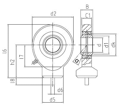 DURBAL Maintenance Required Female Hydraulic-Rod Ends with Pressed Spherical-plain Bearing (Round Welding Slope and Dowel Pin): Threaded female hydraulic rod end consisting of a forged, weldable steel housing with a steel, hardened, ground, phosphated outer ring with single split, oil groove and drill holes and a steel joint ball (Outer ring has a split from size 15) . Used for heavy static or changing loads, shock loads. Suitable for the fixing of piston rod ends and hydraulic cylinder bases. Rod ends from size 25 can be greased subsequently by means of a conical grease nipple. Hydraulic rod ends are fixed as standard with maintenance required DGE_E (size 10, 12) and DGE_ES (size 15-80) radial-spherical-plain bearings; with round welding stud and dowel pin. Temperature range -40 deg C to +200 deg C.