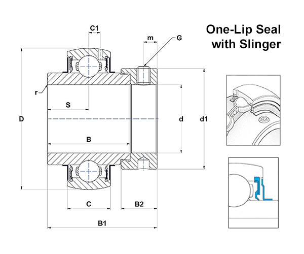 SNR EX Full Width Spherical Outer Bearing Insert with Eccentric Collar: This bearing insert is a standard version designed for robust performance. Each steel insert features a single lip seal and slinger on both sides, along with a wide inner ring design. It includes a zinc-coated sheet steel retainer over-molded with NBR, with an axially preloaded seal lip and a preconnected, zinc-coated sheet steel slinger for improved protection against mechanical impacts and particles. This bearing insert supports medium to high rotation speeds.