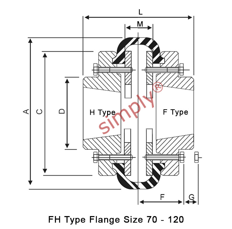 Supplied as a complete coupling assembly (except for tapered locking bushes as you will need to select the shaft size for your application). The assembly comprises of 2 steel flanges and a matching tyre element. This coupling assembly is the F type where the larger diameter of the taper bore is on the same side of the tyre clamping flange and the H type where the larger diameter of the taper bore is on the opposite side to the tyre clamping flange.