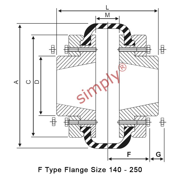 Supplied as a complete coupling assembly (except for tapered locking bushes as you will need to select the shaft size for your application). The assembly comprises of 2 steel flanges and a matching tyre element. This coupling is the F type where the larger diameter of the taper bore is on the same side to the tyre clamping flange.
