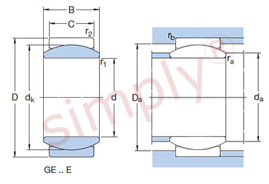 GE..E Series Spherical Plain Bearings: This series is classed as radial spherical plain bearings requiring maintenance. Comprising of sliding contact surfaces of steel against steel these spherical plain bearings are unsealed and require maintenance from time to time in the form of re-lubrication from the sides of the ball. These are metric sized spherical plain bearings. The bearings are manganese phosphated and the sliding contact surface is then treated with a running-in lubricant. This reduces friction and wear during the running-in period. Application: Suitable for heavy static, shock or alternating loads. A characteristic of steel / steel spherical plain bearings is the intentionally fractured outer ring enabling it to be sprung apart to insert the ball, thus care needs to be taken when mounting spherical plain bearings with a fractured or split outer ring, it is essential that the joint is positioned at 90 Degrees to the direction of load. Benefits: Re-lubricate-able, cleanable. |