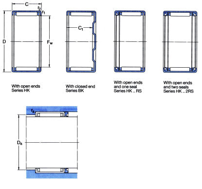 HK Type Drawn Cup Needle Roller Bearings: As the name suggests are needle roller bearings with a deep drawn thin-walled outer ring with open ends. They are characterised by low sectional height and high load carrying ability. They are ideal where a very compact and economical bearing arrangement is required. The RS and 2RS series are fitted with one or two nitrile rubber seals dependent on the suffix. Benefits: Compact low cross section design, high load bearing, low cost and economical, available in sealed and unsealed options. Requires only a bored housing for deployment, the simplest of housing designs. |