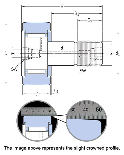 KR-B Series Crowned Cam Followers: Manufactured with needle rollers permitting a thick outer ring allowing for heavy loads and shock to be supported, axial guidance is provided by a flange on the stud side and a pressed on side washer. |