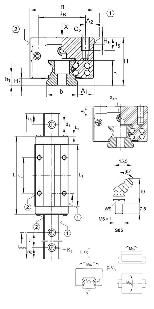 Since they have the maximum possible number of rolling elements, full complement guidance systems have extremely high load-carrying capacity and particularly high rigidity. The carriages have saddle plates made from hardened steel and the rolling element raceways are precision ground. The balls are recirculated in enclosed channels with plastic return elements. The guideways are made from hardened steel and are ground on all faces, the rolling element raceways are precision ground.