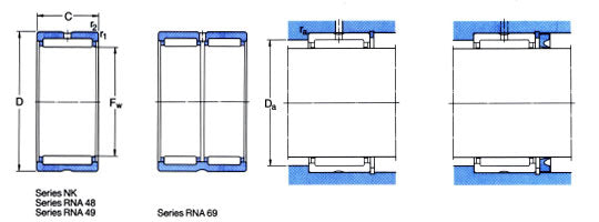 Needle Roller Bearing with Flanges: Manufactured with flanges (annular rings) in the outside housing to locate the needle roller cage, generally of a single row of rollers design with the exception of the RNA69 and NA69 designs which have 2 rows of needle roller cage assemblies. |