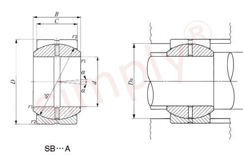 SB..A Type Steel on Steel Spherical Plain Bushings: Steel-on-steel Spherical Bushings have inner and outer rings of high carbon chromium bearing steel, of which sliding surfaces are phosphate-treated and then dry-coated with molybdenum disulfide (MoS2). They can, therefore, operate with low torque, and have excellent wear resistance and large load capacity. They are especially suitable for applications where there are alternate loads and shock loads. They have wide applications mainly in industrial and construction machinery. |