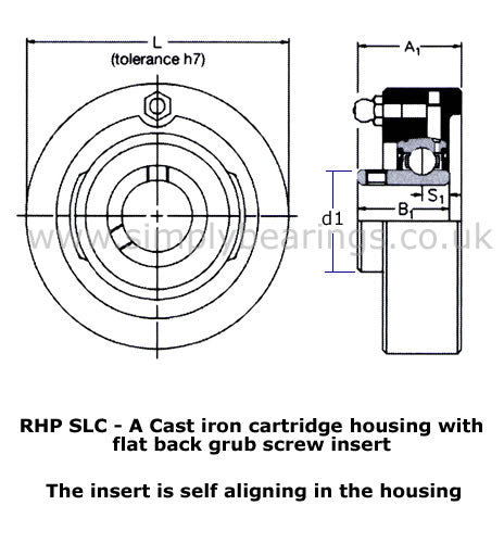RHP SLC A Series Cartridge Bearing Units: Cast iron cartridge bearing unit supplied with a flat back bearing insert fitted and includes a grease nipple to facilitate re-lubrication. The bearing insert has 2 grub screws to allow tightening against the shaft after installation. Cartridge units allow a self aligning bearing inserts to be used where a fixed bearing would normally be used. |