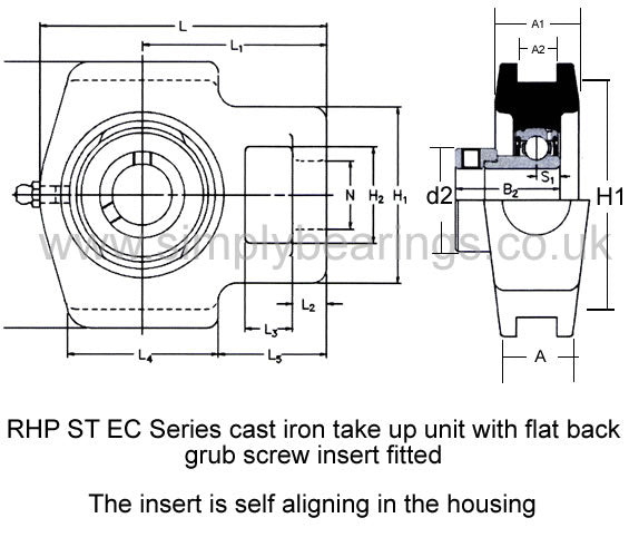 RHP ST EC Series Cast Iron Take Up Housing Units: Take up type cast iron bearing unit supplied with a flat back bearing insert fitted and includes a grease nipple to facilitate re-lubrication. The bearing insert has an eccentric collar and grub screw to allow tightening against the shaft after installation. |