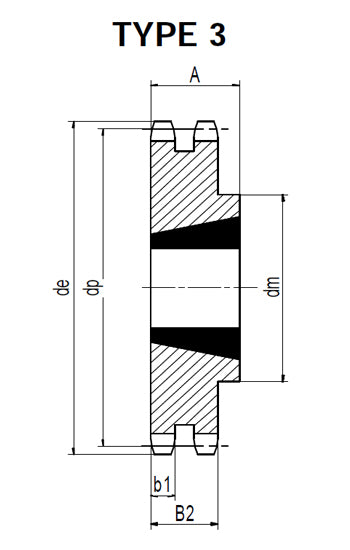 Tapered Bore Sprockets: Small sprockets are usually manufactured from C45 Steel and the large sprockets maybe supplied in G22 Cast Iron. These taper bore sprockets accept tapered locking bushes in a wide variety of shaft sizes to allow the end user to easily fit the sprocket to the shaft with minimal effort and no machining.