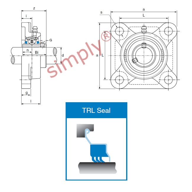 UCF Cast Iron Four Bolt Square Flange Housing: These normal-dutybearing units are fitted with a triple lip seal in a cast iron housing and includes a grease nipple to facilitate re-lubrication. These bearings are perfect for agricultural applications where the bearings are exposed to contamination. The bearing insert has 2 grub screws to allow tightening against the shaft once fitted. The inserts (available separately) can be removed from the housings for future replacement as required.