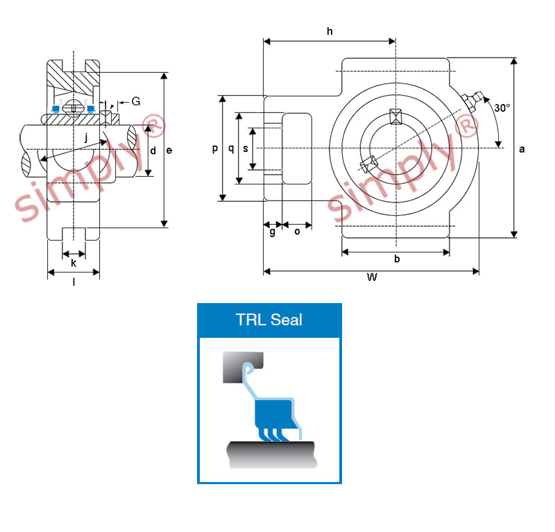 Benefits: High tolerance to harsh environments, cost effective bearing / housing assembly, re-lubricatable, replaceable insert, grub screw fixing