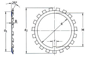 Locking Washers / Tab Washers: These are simple, stable and reliable methods of ensuring that lock nuts remain fastened securely. The central tab locates in a key-way in the shaft and the nut is fitted and tightened to the correct torque, the washer will now have one of its tabs aligned with one of the slots around the lock nut, this tab is folded over into the slot. These lock washers are used with lock nuts of the N and AN series.